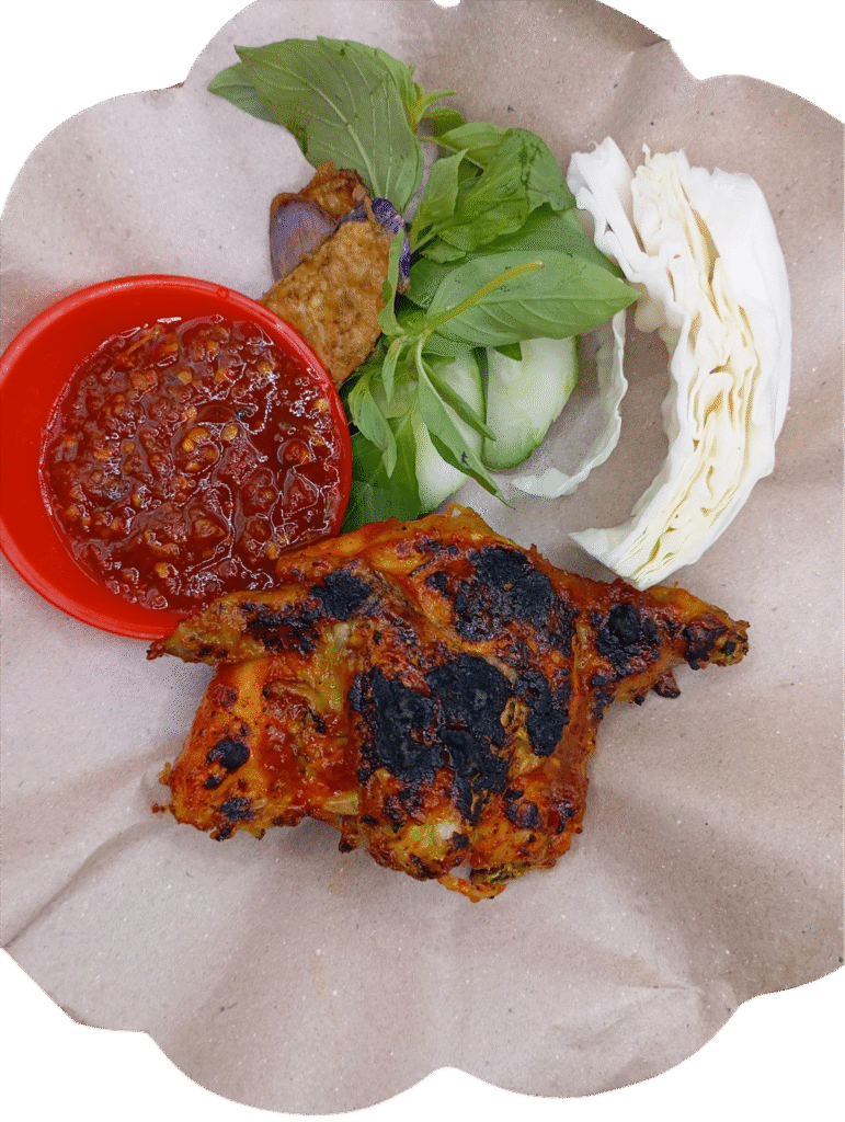 Ayam  Bakar Biasa/Pedas + Sayur Asem + Terong Goreng + Sambal (Terasi/Penyet) + Lalapan.