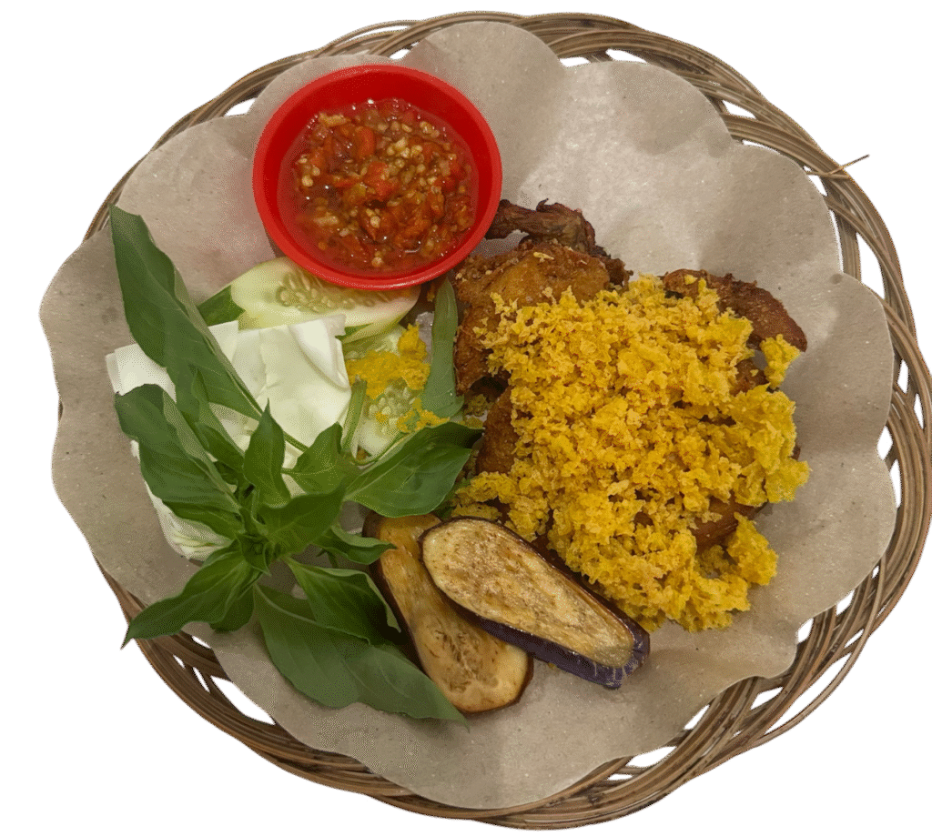 Ayam Goreng + Sayur Asem + Terong Goreng + Sambal (Terasi/Penyet) + Lalapan.